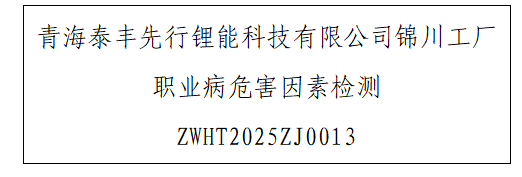 1 用人单位名称 青海泰丰先行锂能科技有限公司 2 用人单位注册地址 青海省西宁市城中区同安路139号 3 联系人 马建孝 4 报告名称及编号 青海泰丰先行锂能科技有限公司锦川工厂职业病...